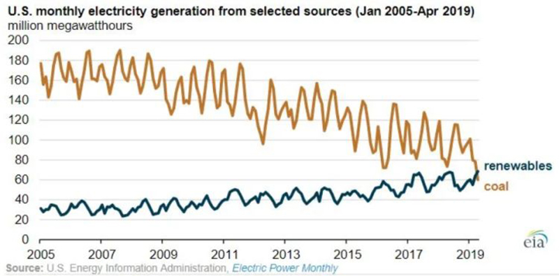 Em abril de 2019, a geração de eletricidade mensal dos EUA a partir de fontes renováveis excedeu a geração a carvão pela primeira vez com base nos dados do EMA’s Electric Power Monthly. As fontes renováveis forneceram 23% da geração total de eletricidade, contra 20% do carvão. Este resultado reflete tanto os fatores sazonais quanto os aumentos de longo prazo na geração de energia renovável e a redução na geração de energia do carvão.