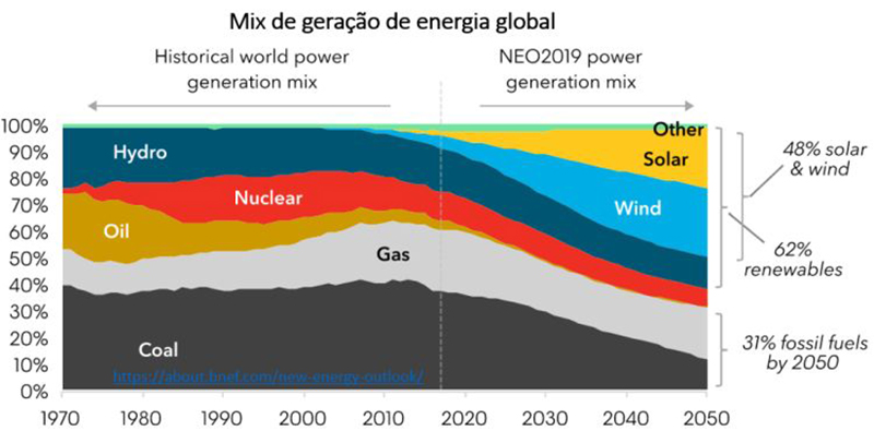 De acordo com a Bloomberg New Energy Finance (BNEF), o contínuo declínio nos custos das tecnologias eólica, solar e de armazenamento de baterias poderá fazer com que o peso das fontes renováveis chegue a 50% da rede de energia global, conforme mostra o gráfico abaixo.
