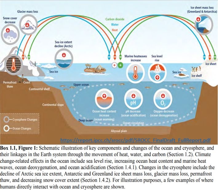 O novo relatório prevê que o nível do mar pode subir até 1,1 metro até 2100, se as emissões de GEE continuarem a subir. Os oceanos e a criosfera desempenham um papel crítico para a vida na Terra. Um total de 670 milhões de pessoas vivem em regiões de montanhas elevadas e 680 milhões de pessoas em regiões costeiras baixas. Quatro milhões de pessoas vivem permanentemente na região do Ártico e pequenos estados insulares em desenvolvimento abrigam 65 milhões de pessoas.