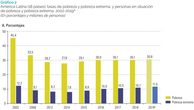 O gráfico abaixo mostra que a taxa de pobreza estava em 45,4% em 2002 e caiu para 27,8% em 2014. Mas com a recessão econômica que atingiu a região a partir de 2014 a tendência se inverteu. Nos anos seguintes a taxa subiu e chegou a 30,1% em 2018, estando projetada para 30,8% em 2019. Cerca de um terço dos latino-americanos vivem em condições precárias.