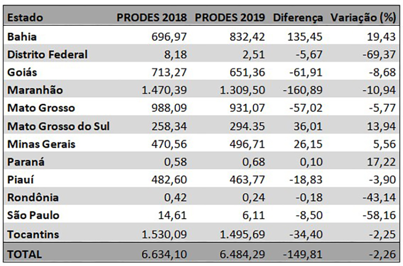 A Tabela 2 apresenta a variação da área de vegetação nativa suprimida entre os anos de 2018 e 2019. No total essa variação foi de – 2,26%, ou seja, a área de vegetação nativa suprimida no Bioma Cerrado foi 2% menor do que no ano passado, mas com valor absoluto muito próximo, totalizando mais de 6 mil km² de vegetação natural suprimida. A maior variação percentual, em relação ao ano anterior, foi no estado da Bahia, com um acréscimo de 19,43%, enquanto o Distrito Federal apresentou um decréscimo de 69,37%.