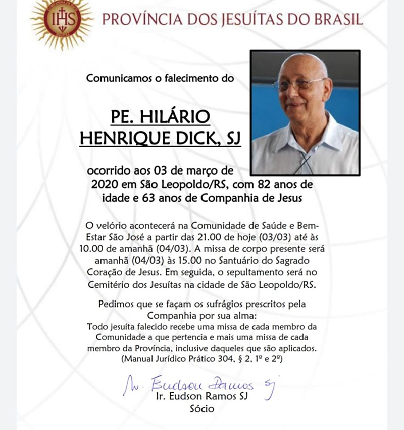 Na tarde de terça-feira, 03-03-2020, o padre Hilário Henrique Dick, jesuíta, um amante e pesquisador das juventudes, faleceu. Nascido na linha João Alves, em Santa Cruz do Sul-RS, no dia 12 de maio de 1937, o padre Hilário construiu uma trajetória de defesa da vida das juventudes, tanto no meio acadêmico quanto pastoral. Sua corajosa atuação de assessor foi mister para a estruturação das Pastorais da Juventude no Brasil e em toda a América Latina, que formou a centralidade do trabalho de evangelização nos próprios jovens como sujeitos.