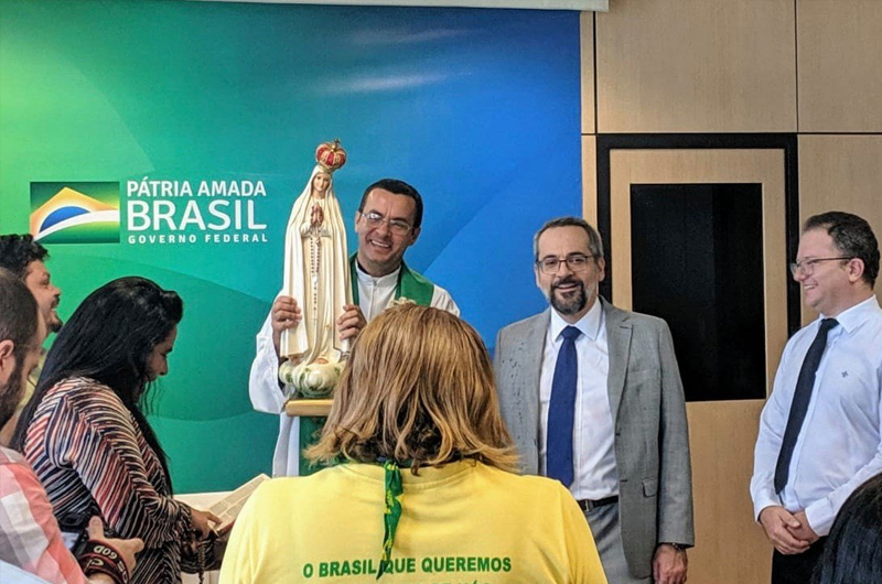 Padre Pedro Stepien levou imagem de Nossa Senhora de Fátima ao gabinete de Abraham Weintraub, no Ministério da Educação. Foto: Templários de Maria