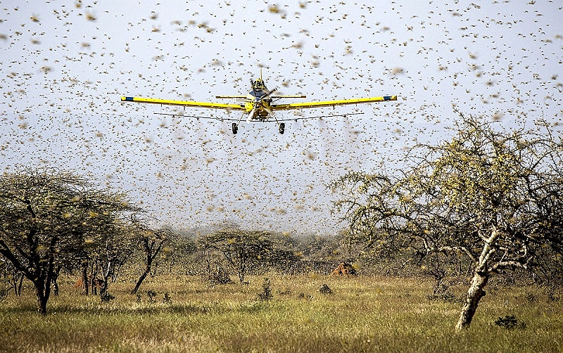 Avião com pesticida tenta combater nuvem de gafanhotos na Argentina. Reprodução: Senasa