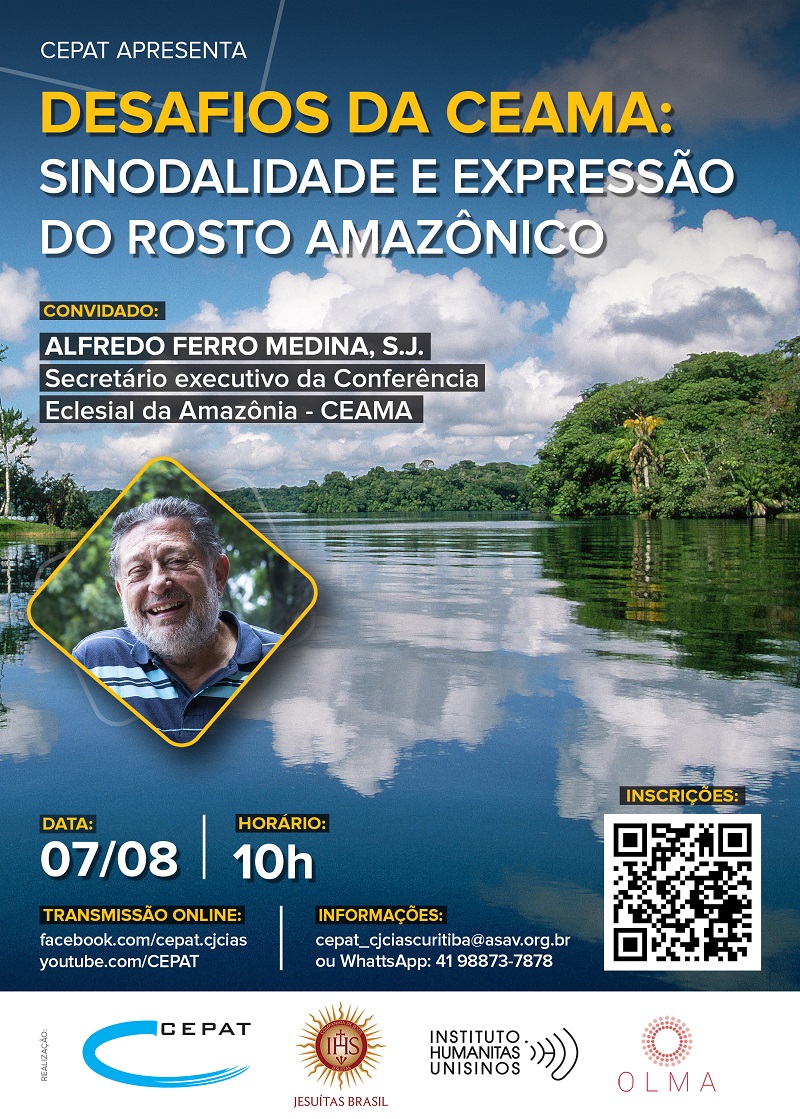 Para nos aproximarmos da dinâmica e dos desafios da CEAMA, no dia 07 de agosto (um sábado), às 10h, realizaremos um encontro [online] intitulado Desafios da CEAMA: sinodalidade e expressão do rosto amazônico, com a presença de Alfredo Ferro Medina, S.J., secretário executivo da CEAMA.