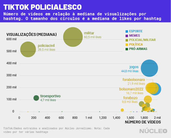 Análise do Núcleo com metadados de 61,4 mil vídeos desde 2016 extraídos do TikTok mostrou que clipes sobre manuseio de armas, prática de tiro e ações policiais, frequentemente incentivando violência por parte de agentes do Estado, acumulam muito mais visualizações do que conteúdo político, por exemplo – embora não estejam totalmente descolados da política.