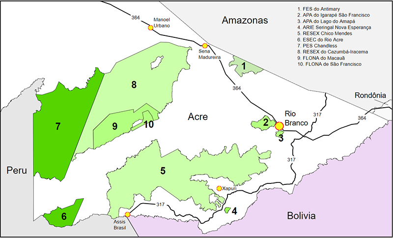 Unidades de conservação no Acre. RESEX Chico Mendes em destaque no nº 5 (Foto: Wikimedia Commons/Aymatth2)