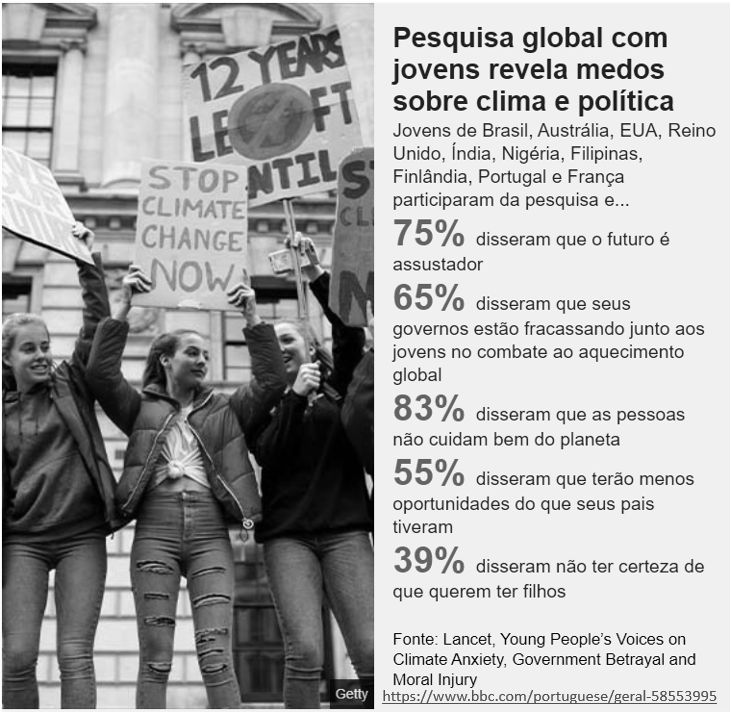 Segundo a pesquisa global – Hickman e Marks (The Lancet, 07/09/2021) – realizada com jovens de Brasil, Austrália, EUA, Reino Unido, Índia, Nigéria, Filipinas, Finlândia, Portugal e França: