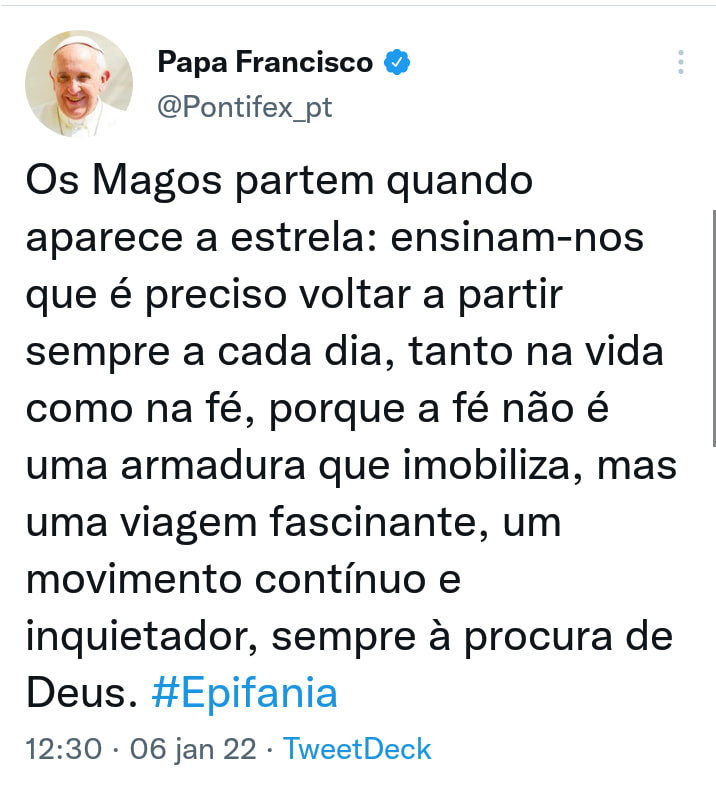 De todo modo, que, através da memória do conto simbólico dos magos que viajam seguindo a estrela, possamos reavivar nossa busca na noite da fé, possamos vislumbrar as estrelas que Deus nos dá para nos orientar na busca e nos alegrar por estarmos juntos nesse caminho macro-ecumênico.