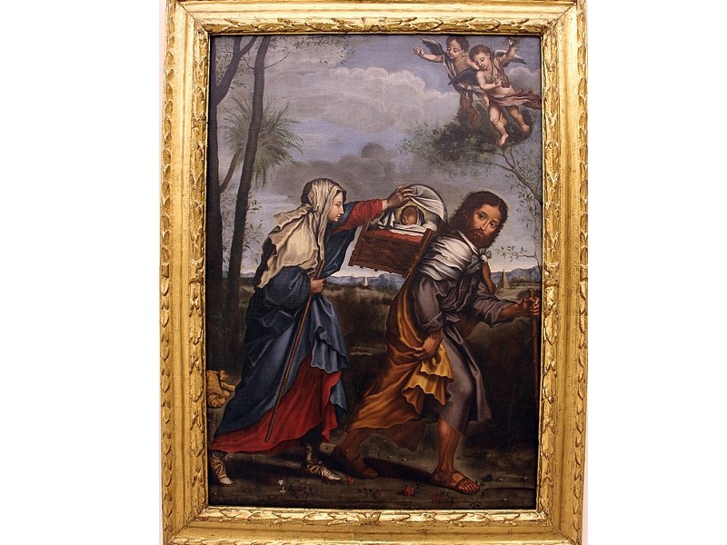 Mas mais ingênuo e comovente é o José que carrega sobre os ombros o berço do Jesus recém-nascido adormecido, cuja cortina é aberta pela mamãe Maria, enquanto os dois fogem para o Egito, obra do século XVII de Bartolomeo Castagnola na Pinacoteca de Sassari.