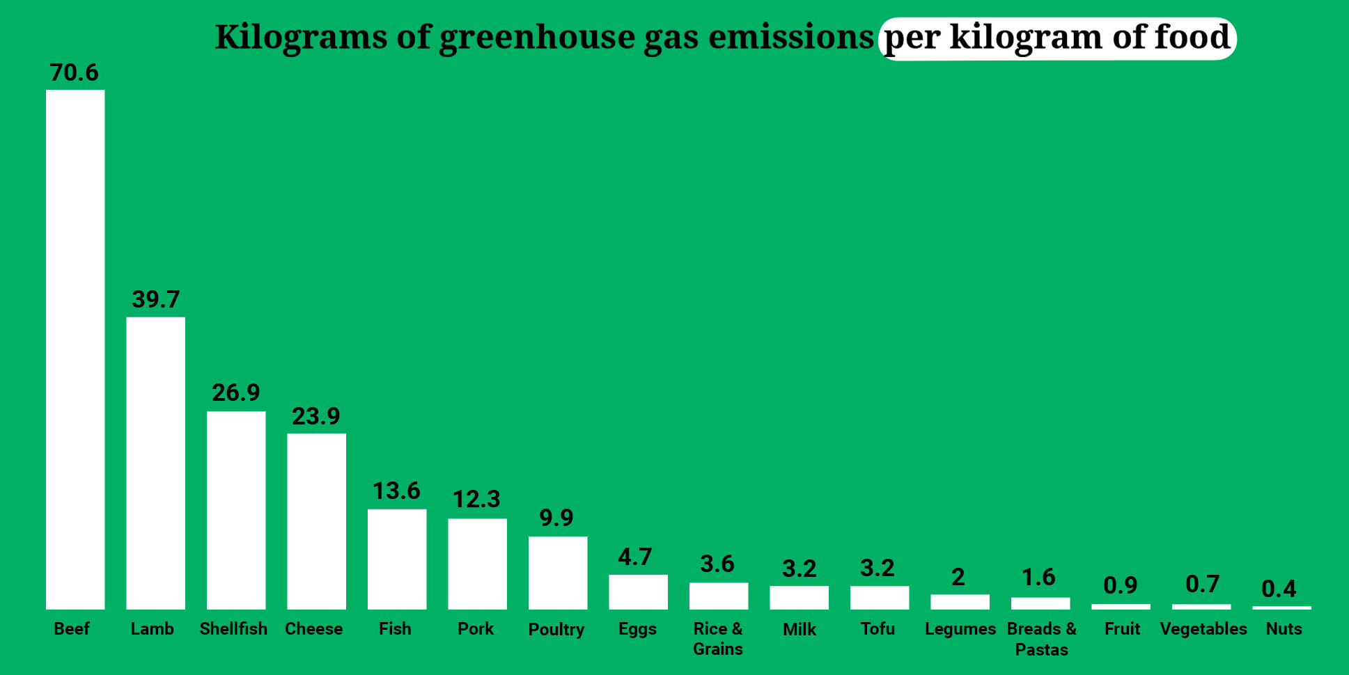 O impacto climático dos alimentos é medido em termos de intensidade das emissões de gases de efeito estufa. A intensidade das emissões é expressa em quilogramas de “equivalentes de dióxido de carbono” – que inclui não apenas o CO2, mas todos os gases de efeito estufa – por quilograma de alimento, por grama de proteína ou por caloria.