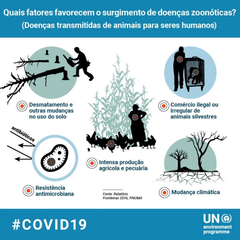 Um infográfico resumindo os fatores de risco ambientais que podem criar doenças zoonóticas, derivado das descobertas do relatório “Fronteiras” do Programa das Nações Unidas para o Meio Ambiente (PNUMA) de 2016 (pdf). Este gráfico foi amplamente divulgado durante os primeiros meses da pandemia de Covid-19 | Fonte: PNUMA