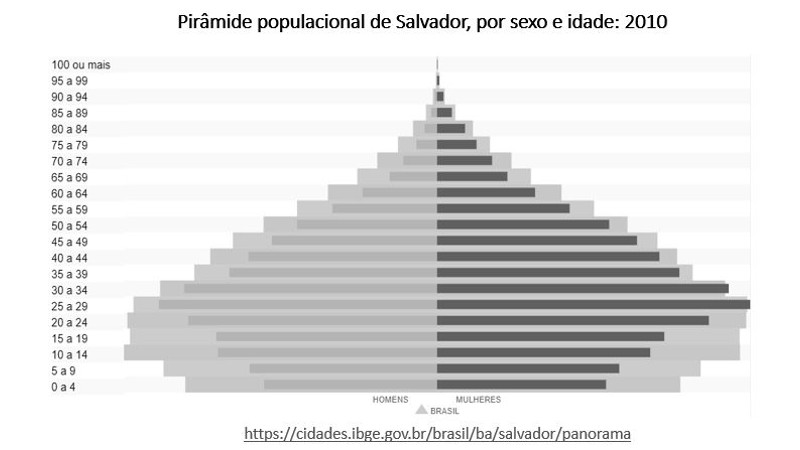 A figura abaixo mostra a pirâmide populacional da cidade de Salvador, sobreposta à pirâmide brasileira, segundo dados do censo de 2010 do IBGE. Nota-se que a estrutura etária de Salvador é mais envelhecida do que a pirâmide nacional, porém o percentual de jovens de 0 a 14 anos é maior do que o percentual da população idosa (60 anos e mais). Portanto, a população de Salvador deve continuar crescendo pelo menos até o fim da década de 2020 e um decrescimento entre 2010 e 2022 não tem muito fundamento na dinâmica demográfica, a não ser que tenha havido uma grande emigração na cidade (o que parece não ser o caso). Sem dúvida, Salvador já cresce menos do que os municípios da região metropolitana, mas um decrescimento entre 2010 e 2022 não estava previsto nas projeções demográficas.