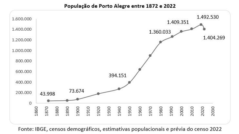 A cidade de Porto Alegre tinha uma população de 44 mil habitantes em 1872, passou para 73,7 mil em 1900, chegou a 394,2 mil em 1950, deu um salto para 1,36 milhão no ano 2000 e atingiu 1,409 milhão em 2010. A população de Porto Alegre cresceu 32 vezes entre 1972 e 2010. E embora as estimativas de 2021 tenham indicado 1,49 milhão de habitantes, a prévia do censo 2022 indicou “apenas” 1,404 milhão de habitantes, o que significa 88 mil pessoas a menos que em 2021 e 5 mil pessoas a menos do que em 2010.