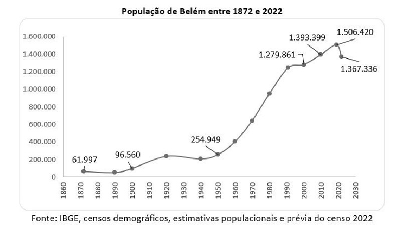 A cidade de Belém tinha uma população de 61 mil habitantes em 1872, passou para 96,6 mil em 1900, chegou a 254,9 mil em 1950, deu um salto para 1,28 milhão no ano 2000 e atingiu 1,39 milhão em 2010. A população de Belém cresceu 23 vezes entre 1972 e 2010. E embora as estimativas de 2021 tenham indicado 1,506 milhão de habitantes, a prévia do censo 2022 indicou “apenas” 1,37 milhão de habitantes, o que significa 139 mil pessoas a menos que em 2021 e 26 mil pessoas a menos do que em 2010.