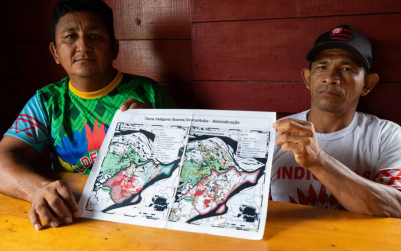 As lideranças indígenas, tuxaua Sergio do Nascimento e seu vice-tuxaua, Vavá dos Santos, mostram mapa com a autodemarcação da TI Soares/Urucurituba. (Foto: Bruno Kelly | Amazônia Real)