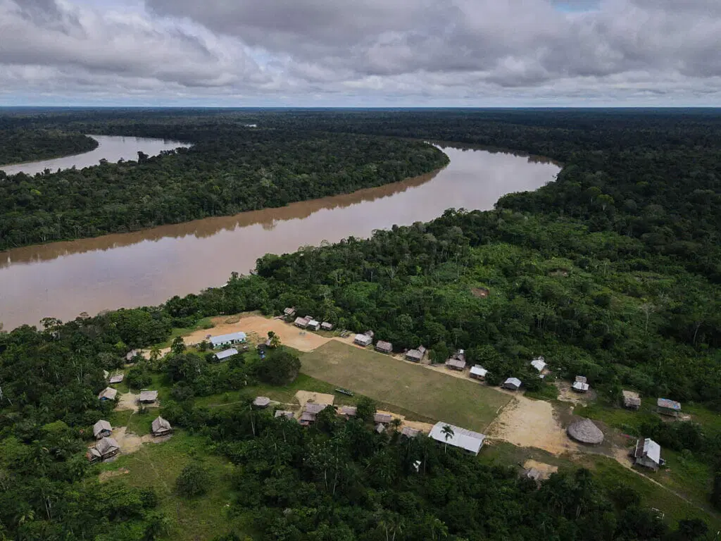 Vista aérea da Aldeia São Luís, do povo Kanamari, localizada na região do Médio Rio Javari, na TI Vale do Javari (Foto: Bruno Kelly | Amazônia Real)