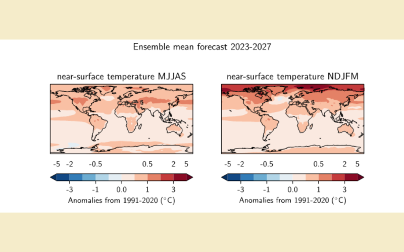 Há uma probabilidade de 66% de que a temperatura global média anual próxima à superfície entre 2023 e 2027 seja mais de 1,5°C acima dos níveis pré-industriais por pelo menos um ano. Há 98% de probabilidade de que pelo menos um dos próximos cinco anos, e o período de cinco anos como um todo, seja o mais quente já registrado.