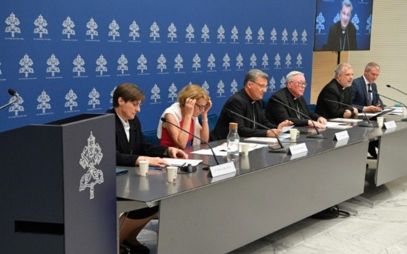 Mesa dos relatores na coletiva de imprensa (Foto: Vatican Media)