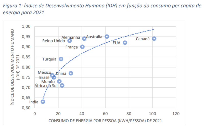 Quanto maior o consumo de energia per capita, maior o Índice de Desenvolvimento Humano (IDH) dos países. O consumo de energia está correlacionado, reforça e é reforçado, pelo desenvolvimento das nações. Não existe país com alto desenvolvimento humano e baixo consumo relativo de energia.