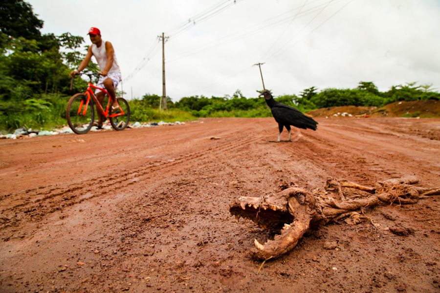 Um ciclista passa por um local clandestino de descarte de resíduos em Barcarena. (Foto: Wagner Almeida | InfoAmazonia)