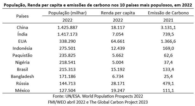 A tabela abaixo resume os números para 2022, apresentando os dados da população, da renda per capita e da emissão de carbono (para 2021). A China, que ainda era o país número 1 em termos demográficos, conseguiu aumentar a renda per capita e, consequentemente, passou a liderar com larga margem as emissões de carbono. A China sozinha emite mais do que os outros 9 países em conjunto.