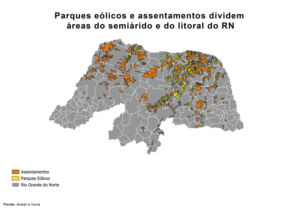 O Rio Grande do Norte lidera a produção nacional de energia gerada por ventos. São 386 parques em operação ou em construção, sendo 48% destes a menos de 1,5 km de assentamentos rurais.