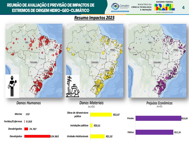 Durante a reunião, o Cemaden também apresentou dados que constam do relatório de danos informados do Sistema Integrado de Informações sobre desastres (S2ID), do Ministério da Integração e Desenvolvimento Regional (MIDR), sobre os impactos dos eventos extremos. Foram registradas 132 mortes associadas a eventos relacionados a chuvas, com 9.263 pessoas feridas ou enfermas, e 74 mil desabrigados. No total, 524 mil pessoas ficaram desalojadas. As regiões mais afetadas foram o Sul do país, municípios de regiões metropolitanas das grandes capitais, vale do Maranhão, sudeste do Pará e municípios ribeirinhos do rio Amazonas.