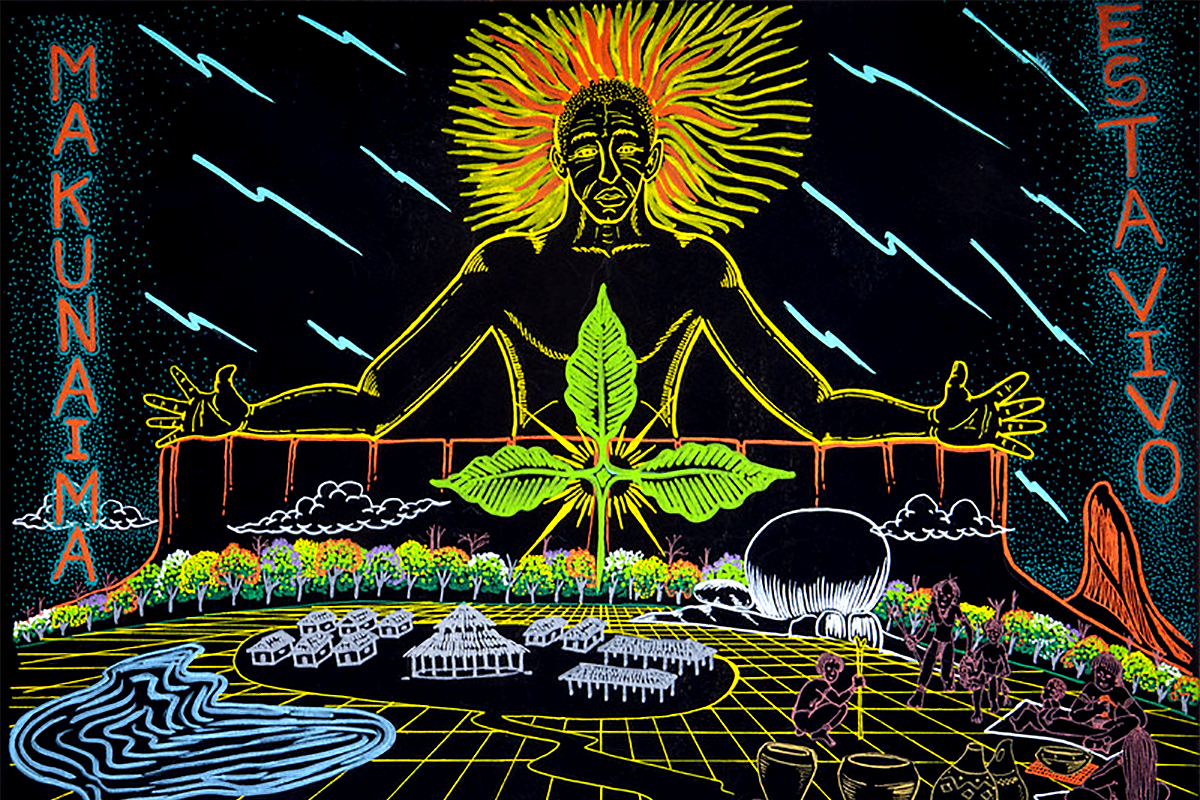 Se essa conversa tivesse acontecido há tempos atrás, ficaria mais difícil acompanhar a narrativa de Ibã. Mas algo mudou substancialmente nos últimos tempos com a difusão da arte indígena nos museus e centro culturais das capitais brasileiras. Fato que contribuiu para que os elementos descritos pelo cacique encontrassem eco num conjunto de cores, desenhos e linhas presentes na minha memória. Uma plasticidade rica de elementos gráficos que promoveram a inserção da cosmovisão indígena no mais disputado circuito brasileiro das artes plásticas. Momento que culminou com a 34ª edição da Bienal de São Paulo, que ficou conhecida como a “Bienal dos Indígenas“. O que Ibã desenha com os dedos enquanto fala comigo pelo vídeo, num conjunto etéreo de linhas, dialoga diretamente com os elementos presentes nos trabalhos de Daiara Tukano, Sueli Maxakali, Jaider Esbell, Uýra, Denilson Baniwa, Gustavo Caboco – entre outros artistas presentes na edição da mostra.