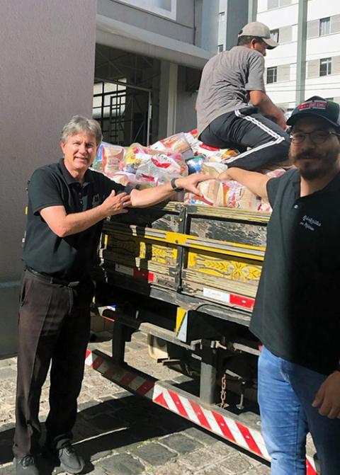 Pe. Joaquim Parron, à esquerda, e membros de sua equipe da Congregação dos Padres Redentoristas carregam cestas de bens práticos para famílias carentes na periferia de Curitiba, em 12-09-2023. (RNS/Cortesia de Joaquim Parron)