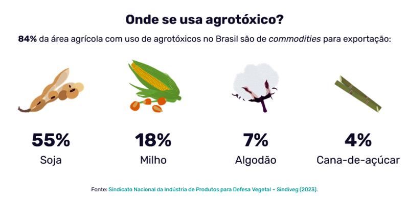 O agronegócio argumenta que, sem os descontos fiscais, a produção de alimentos diminuiria, aumentando o preço de itens essenciais. Mas o Brasil destina 84% dessas substâncias para o cultivo de seis commodities para exportação, especialmente soja, milho, cana-de-açúcar e algodão.