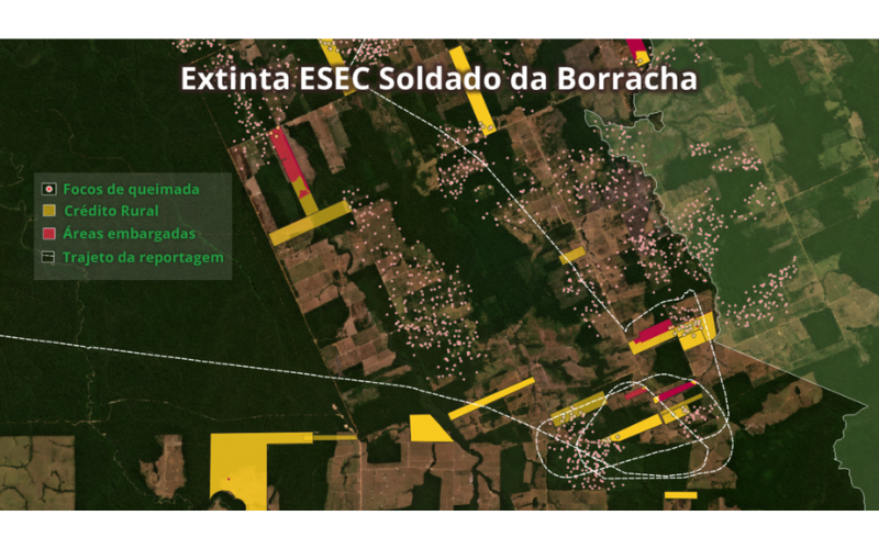 “Diversas propriedades nessas áreas acessaram o crédito rural. Algumas estão embargadas por desmatamento, mas todas elas fizeram uso do fogo de forma ilegal”, afirma Thaís Bannwart, porta-voz de Florestas do Greenpeace Brasil, sobre as fazendas na extinta ESEC Soldado da Borracha.