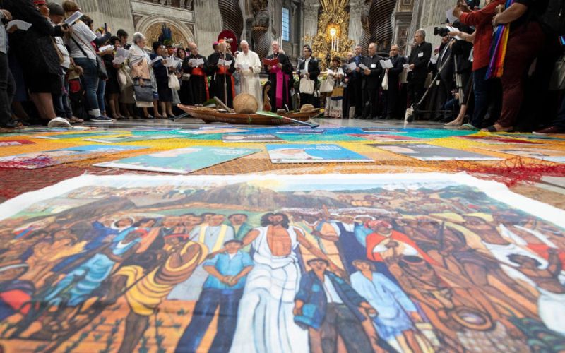 Homens e mulheres, alguns em trajes indígenas tradicionais, encheram os transeptos e a cúpula de um dos locais mais sagrados do catolicismo com uma canção de oração ao lado de cardeais e bispos. Em frente ao imponente altar principal, eles levantaram uma pequena canoa escavada enfeitada com redes de pesca e cercaram o Papa Francisco, acompanhando-o em uma procissão até o salão de audiências vizinho, onde o pontífice abriu as deliberações de um mês do Sínodo dos Bispos para a região da Pan-Amazônia.