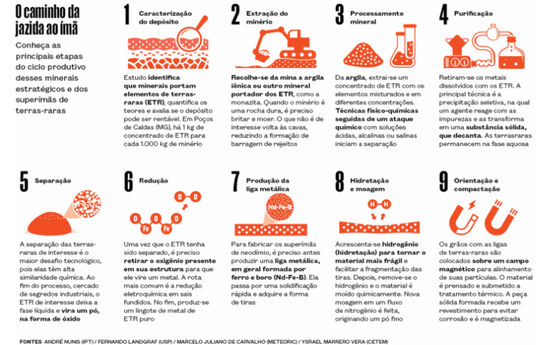 Um prédio de três andares com fachada envidraçada localizado em Lagoa Santa, município a 35 quilômetros de Belo Horizonte, sedia uma estrutura fabril e laboratorial que poderá ajudar o Brasil a dominar o ciclo completo de produção de ímãs permanentes de terras-raras. Também chamados de superímãs, em razão de sua elevada força magnética e resistência à desmagnetização, esses componentes são usados em aplicações relacionadas à defesa, energia limpa e mobilidade elétrica, com destaque para motores de carros elétricos e de turbinas eólicas. O principal elemento químico empregado em sua fabricação, o neodímio (Nd), é uma das 17 terras-raras da tabela periódica, consideradas fundamentais para a transição energética. Por causa de suas propriedades especiais, como magnetismo intenso, luminescência e condutividade, esse grupo de elementos químicos é largamente usado em produtos e processos de alta tecnologia. Além dos superímãs, são empregados na fabricação de catalisadores usados pela indústria de óleo e gás, fibras ópticas, telas de computadores, celulares, jatos militares, mísseis e marcadores luminescentes para análises biomédicas (ver infográfico). Nos últimos tempos, as terras-raras têm estado no centro de uma disputa geopolítica mundial.