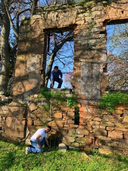 Fig. 4. Felipe Soriano e Edison Hüttner realizando medidas na fachada do Posto da Estância Jesuítica de Yapeyú (Fazenda Sobrado) Foto: Everson Dornelles