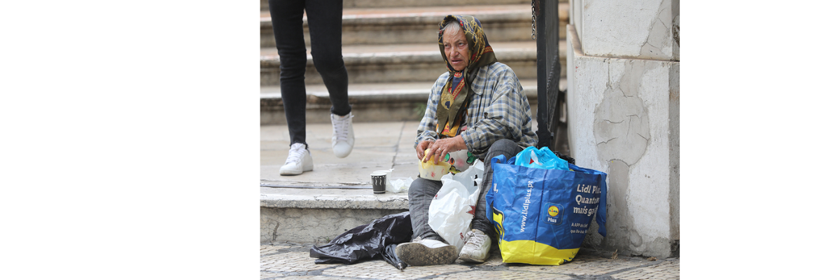 Um pedestre passa por uma mulher sem-teto em Lisboa, Portugal, 02-08-2023. (Foto: OSV News/Bob Roller)