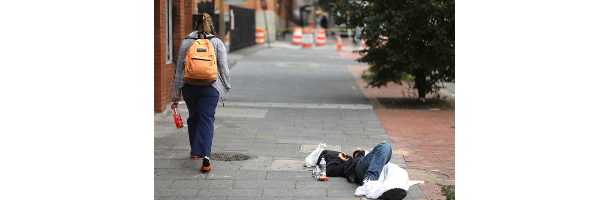 Uma mulher passa por um morador de rua dormindo na calçada em Baltimore, 6 de junho de 2023. (Foto: OSV News/Bob Roller)