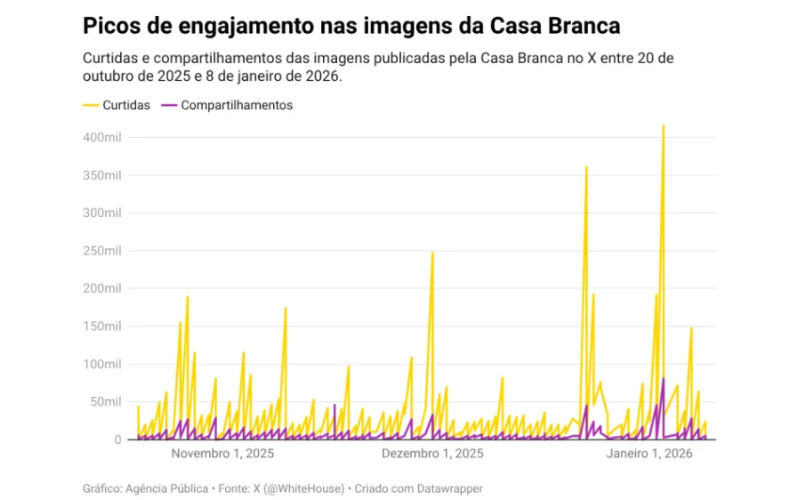 A equipe de reportagem da Agência Pública levantou todas as imagens publicadas pela Casa Branca na rede social X (antigo Twitter) entre 20 de outubro de 2025 e 8 de janeiro de 2026. No período, foram 639 postagens com imagens, que tiveram, em média, 19,2 mil curtidas e 3,7 mil compartilhamentos por publicação.