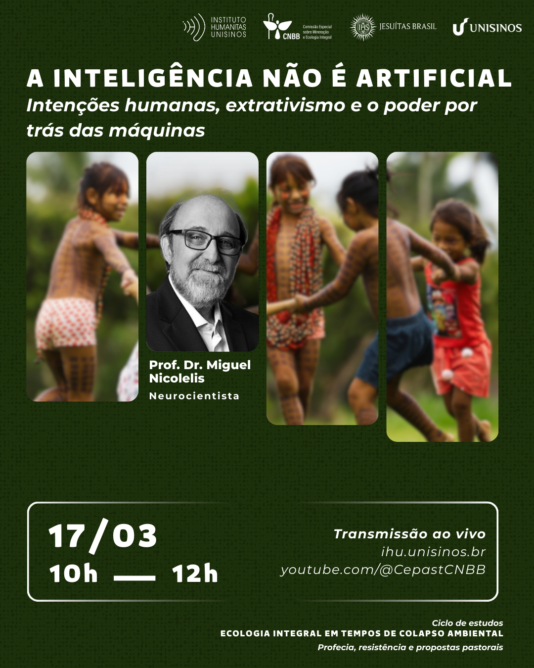 Em 17 de março deste ano, o ciclo abordará o extrativismo à luz da Inteligência Artificial (IA). O neurocientista Miguel Nicolelis ministrará a videoconferência “A Inteligência não é Artificial. Intenções humanas, extrativismo e o poder por trás das máquinas”. O pesquisador vai problematizar os aspectos envolvidos no desenvolvimento desse tipo de tecnologia. Segundo ele, somente 2024 “foram 300 bilhões de dólares investidos em empresas de IA; fora a água, a energia, o solo, a poluição atmosférica e o fato de que um data center moderno não gera emprego e não tem retorno nenhum”.