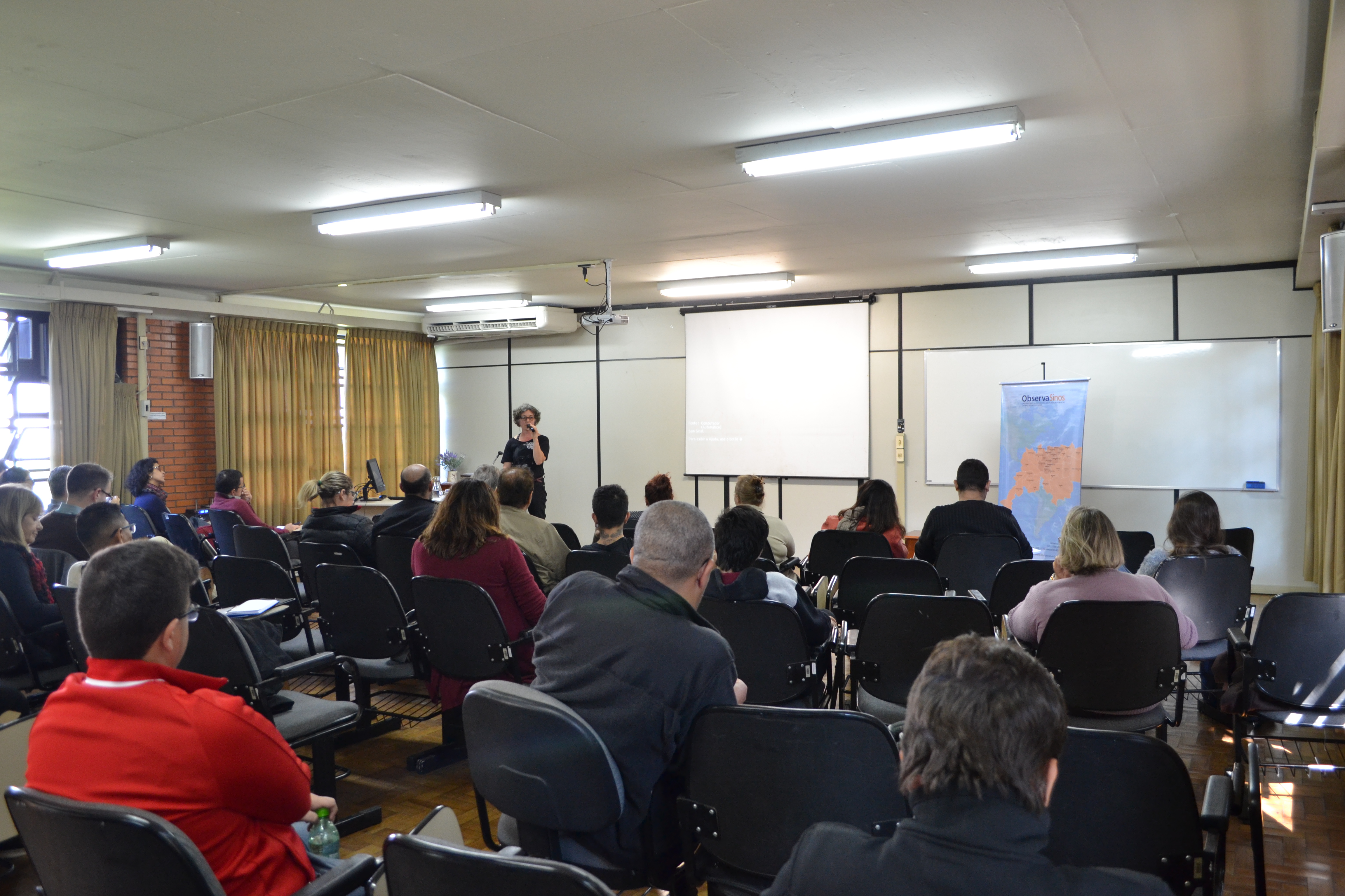 O evento contou com a participação de 45 pessoas, que se dividiam entre militantes e apoiadores/as da causa da Economia Solidária, gestores/as e trabalhadores/as do poder público de municípios do Vale do Sinos, estudantes, pesquisadores/as e membros de grupos de Economia Solidária da região.