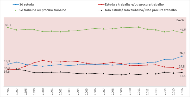 Um dado preocupante, embora refira-se a uma parcela menor, é o número expressivo da juventude que não participava dos circuitos da educação regular ou do trabalho remunerado. Entre 1996 e 2016, esse percentual da população juvenil declinou pouco, passando de 15,1%, em meados dos anos de 1990, para os atuais 12,1%.