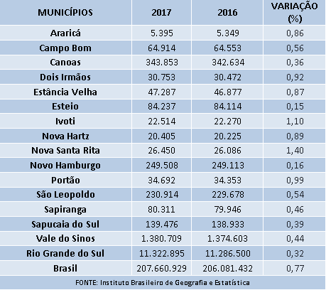Os dados fazem parte das estimativas populacionais realizadas pelo Instituto Brasileiro de Geografia e Estatística – IBGE, e têm como data de referência 1º de julho de 2017. O estudo ainda releva que o Brasil tem 207,7 milhões de habitantes e uma taxa de crescimento populacional de 0,77% em relação ao ano passado (206,1 milhões). O Rio Grande do Sul, que ficou abaixo da média nacional, obteve um crescimento populacional de 0,32%. Isso deve-se ao fato de o estado estar em uma fase mais avançada de envelhecimento populacional e de crescimento demográfico entre os demais estados brasileiros.