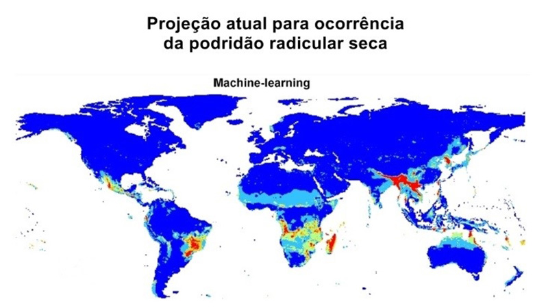 O estudo apontou áreas tropicais altamente favoráveis para a intensificação da podridão radicular seca na América Central, América do Sul, continente africano e sudoeste da Ásia, onde o método estatístico foi mais fiel aos registros da doença, em comparação ao machine learning.
