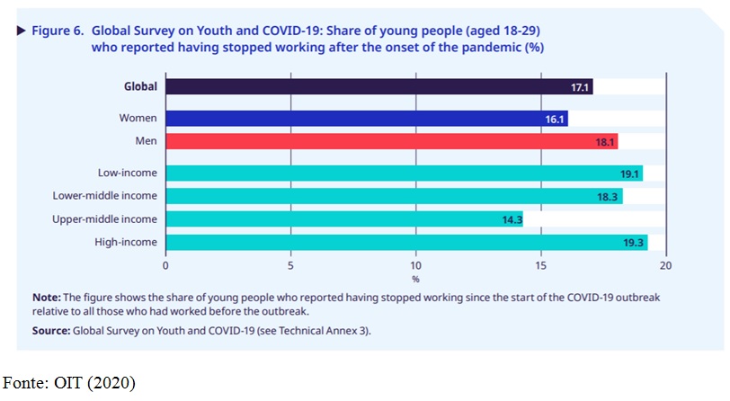 Os jovens são um grupo que, estruturalmente, enfrenta maior vulnerabilidade, menores salários e maior desocupação. Segundo a OIT, 328 milhões (ou 77% dos jovens no mundo) estavam no setor informal, enquanto 60% dos trabalhadores adultos (com mais de 25 anos) estavam na informalidade. Porém, as disparidades etárias podem aumentar com a crise: a OIT tem chamado atenção para os efeitos de longo prazo da crise para a “geração lockdown” , que ficará marcada pela interrupção dos estudos, treinamentos e entrada no mercado de trabalho, bem como pelo desemprego e pela perda de renda. Segundo a OIT, 1 em cada 6 trabalhador jovem já deixou de trabalhar desde o início da crise em todo o mundo.