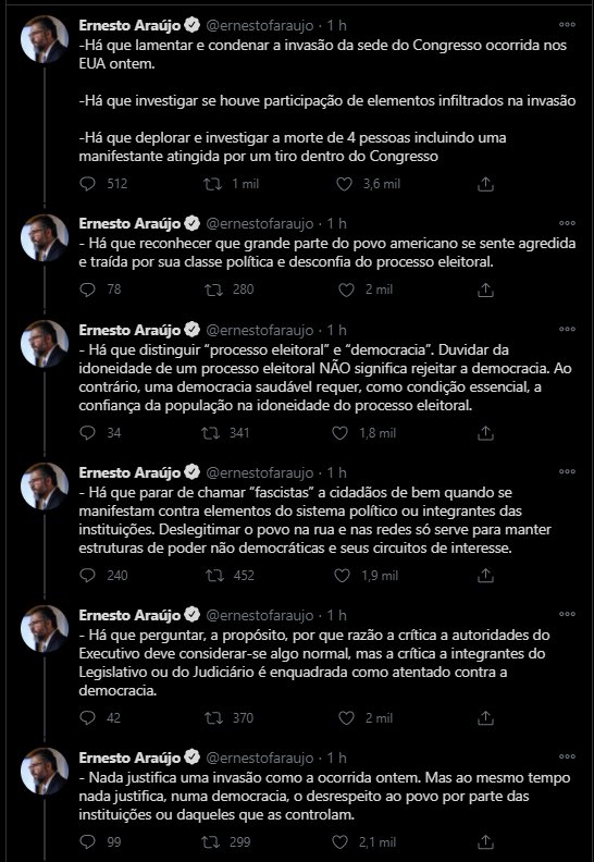 Tuítes do Ministro das Alucinações Exteriores sobre a tentativa de Golpe nos Estados Unidos: