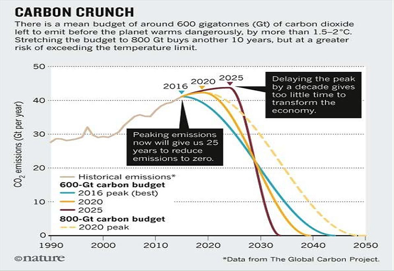 Figura 2 – Datas iniciais e finais de redução a zero das emissões atmosféricas de CO2 (Foto: Christiana Figueres, Hans Joachim Schellnhuber, Gail Whiteman, Johan Rockström, Anthony Hobley & Stefan Rahmstorf, “Three years to safeguard our climate”, Nature, 28/VI/2017, a partir de dados do The Global Carbon Project)