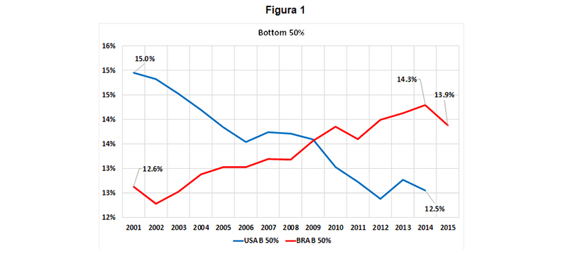 A figura 1 apresenta a evolução da participação na renda dos 50% mais pobres – a “classe trabalhadora” ou “batalhadora” (Souza 2012) – no Brasil e nos EUA. Os dados do Brasil vão até 2015, os dos EUA até 2014. Os números mostram que, nos EUA, parcela da renda dos 50% mais pobres caiu de 15% para 12,5% do total entre 2001 e 2014. No caso do Brasil houve movimento inverso, isto é, a parcela dos mais pobres aumentou de 12,6% para 14,3% no mesmo período.